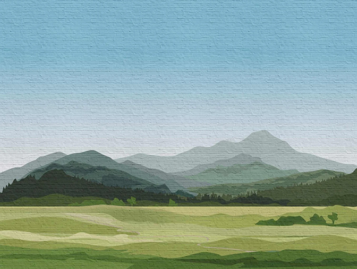Digitaldruck mit gemalter Landschaft auf Steinmauer in grün, blau – 38298-1 | 382981