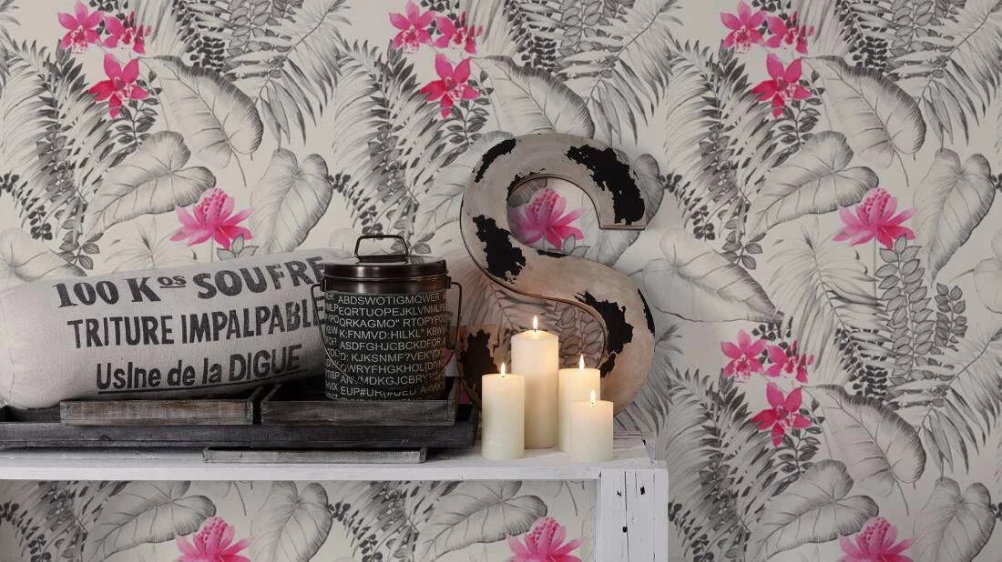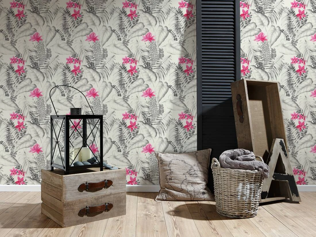 Aus der Kollektion Exotic Life vermitteln die Tapeten aus Vlies tropische Wohngefühle und bringen Urlaubsstimmung in die eigenen vier Wände. Die Tapete in weiß-grau und pink und schwarz überzeugt mit ihrem wohnlichen Design und ihren hervorragenden Materialeigenschaften.
