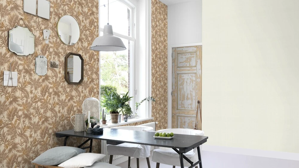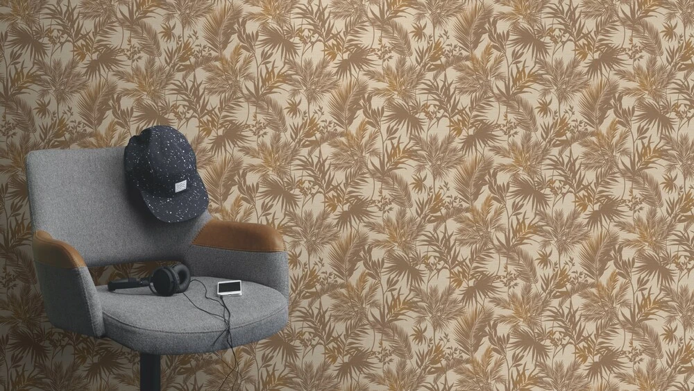 Die Tapeten von Rasch aus der Kollektion „Kalahari“ bringen sofort Ruhe und Geborgenheit in deine eigenen vier Wände. Die natürlichen Muster wirkt wohnlich und passen sich deinem Interieur perfekt an. Die Vliestapete 704136 mit Blätter im Dschungel in beige, gold, braun und leichtem metallischem Glanz sorgt für ein warmes Lebensgefühl und lädt zum Entspannen ein.